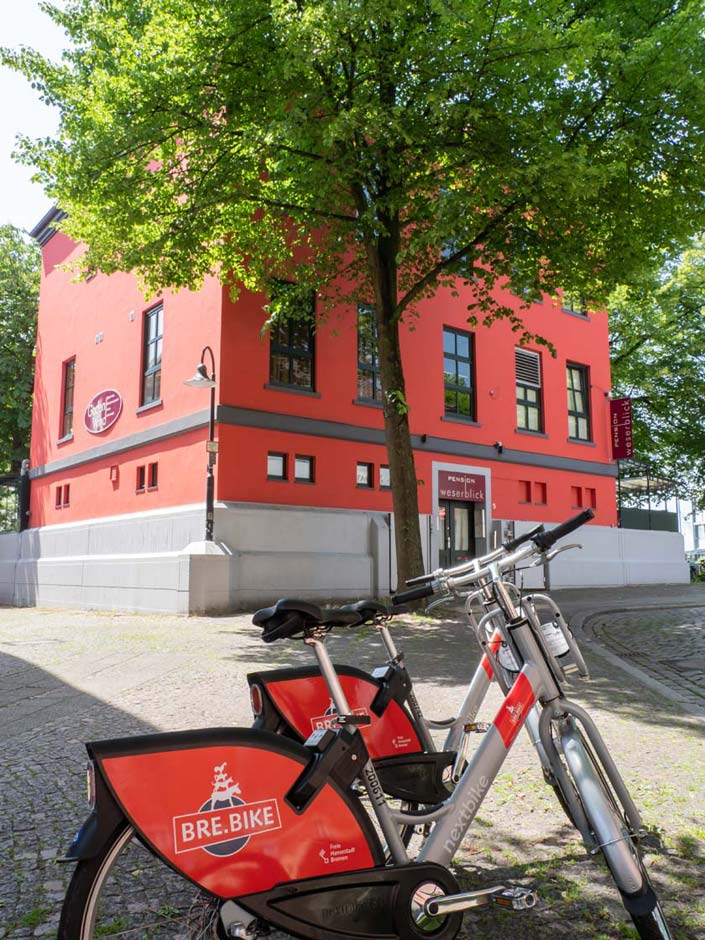 Radfahrer nutzen unsere Pension für ihre Radtour auf dem Weser-Radweg (zw. Nieburg, Bremen und Nordenham). Bremen ist einer der fahrradfreundlichsten Orte in ganz Europa und wird daher auch oft als "Fahrradstadt" bezeichnet. Erlebnisreiche Routen führen z.B. durch die Überseestadt, den grünen Bürgerpark, die östliche Vorstadt, durch das Blockland oder Vegesack.
